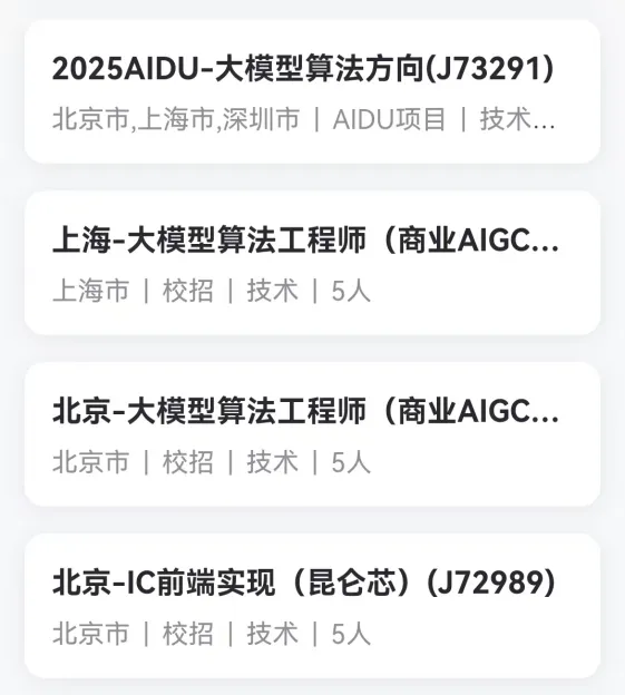 譬如,百度2025校园招聘,提供了超3000个岗位,约80%为AI技术相关岗位,需求最大的岗位是机器学习、数据挖掘、自然语言处理等,尤为值得一提的是新增了大模型算法工程师的校招岗,入职之后可参与大规模预训练模型的研发。